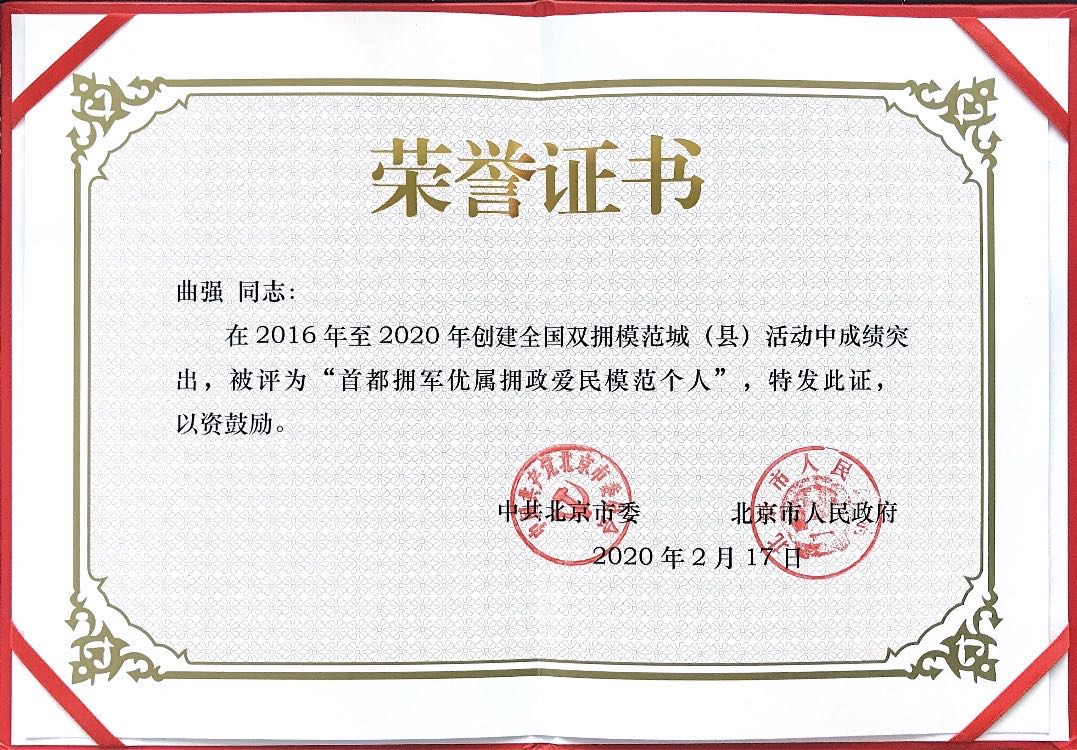 beat365正版唯一官网必一教师曲强评为北京市“首都拥军优属拥政爱民模范个人” beat365曲强老师于去年底经学校推荐通过全市评比,于今年被北京市评为“首都拥军优属拥政爱民模范个人”。曲强老师长期坚持从事拥军工作,担任武警特警学院客座教授,为国防大学客座讲授培训课程。发扬了beat365正版唯一官网必一长期以来的拥军优属传统,为我校拥军工作做出了贡献。