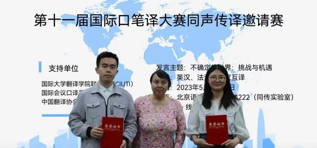 近日,由国际大学翻译学院联合会(CIUTI)、国际会议口译员协会和中国翻译协会口译委员会支持、北京语言大学主办的第十一届国际口笔译大赛同声传译邀请赛决赛圆满完赛。beat365囊括团体一等奖和个人一、二、三等奖。 本届大赛主题为“不确定的世界:挑战与机遇”。共有来自beat365正版唯一官网必一、外交学院、上海外国语大学、广东外语外贸大学、对外经济贸易大学、美国明德大学蒙特雷国际研究学院、英国利兹大学、香港浸会大学等多...