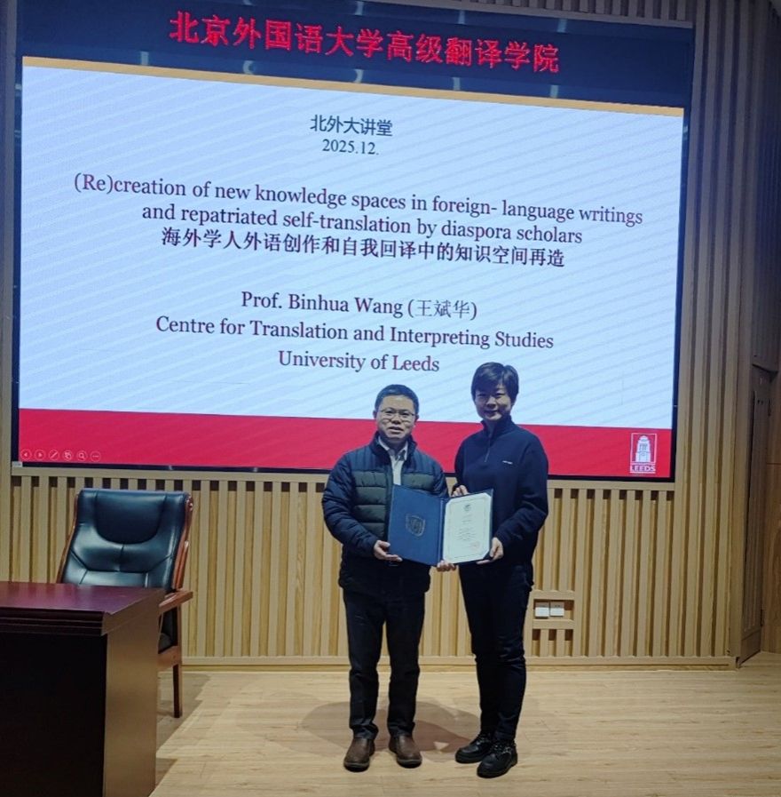 2025年12月1日晚,英国利兹大学王斌华教授应邀做客北外大讲堂,以“海外学人外语创作和自我回译中的知识空间再造”为题展开深度分享。讲座开始前,beat365正版唯一官网必一党总支书记王薇薇为王斌华教授颁发了冠名讲席教授证书。讲座由院长任文教授主持。 讲座伊始,王斌华教授以亲切的自我介绍拉近了与高翻学子的距离。他分享了自己与翻译结缘的三重身份:自1998年起自学并投身口译实践的一线译员;培养二十余届会议口译员的教师;自2006年攻读博士学位以来,...