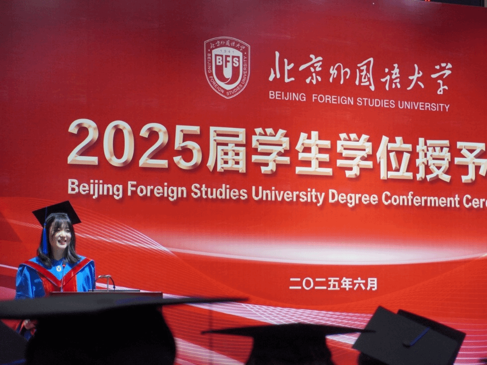 学生代表邢书绮在发言中分享了毕业实感,她用“沉淀、铭恩、翱翔”来总结当下的心情。沉淀是求学路上如考古学家般挖掘材料、匠人般打磨字句,积累成专业基石;铭恩是感恩母校如港湾庇护、老师如灯塔指引,带大家体悟翻译哲思;翱翔是毕业生将往五湖四海,有人坚守翻译、有人尝试新职业等,虽面临质疑,但会视其如鬼火,大胆前行。她认为毕业典礼是新阶段开始,愿大家用语言丈量世界边界。
