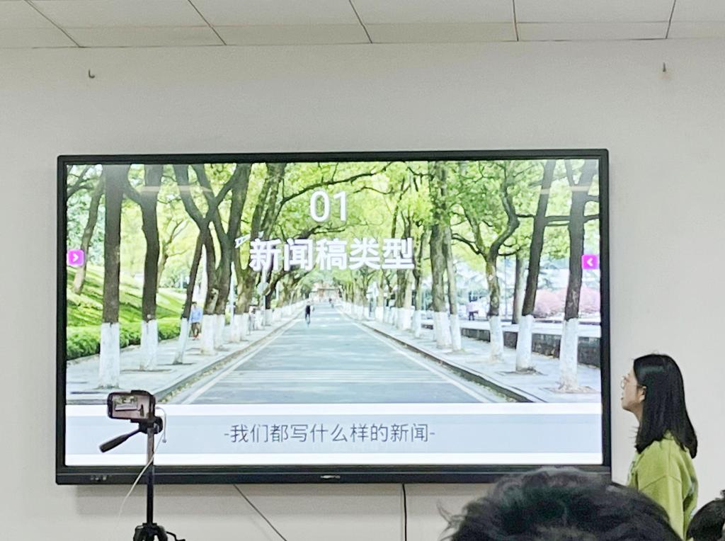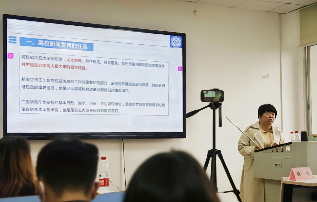接着,韩艳老师从高校新闻宣传的任务、高校新闻宣传的问题、怎样做好校园新闻报道和工作思考建议四个方面分享自己的经验。韩艳老师认为,校园新闻分为对内和对外两个层面,是相互联系和统一的,并叮嘱同学们宣传要坚定服务学院中心工作,塑造名片,起到举旗帜、聚民心、育新人的使命任务。韩艳老师举例相关工作实例,真切而清晰地感受到新闻工作的温度———新闻是有信息、有价值、有情感的;根据学校中心工作的周期性和规律性,应了解师生需求、识别新闻价值、联动盘活资源、提升队伍能力。