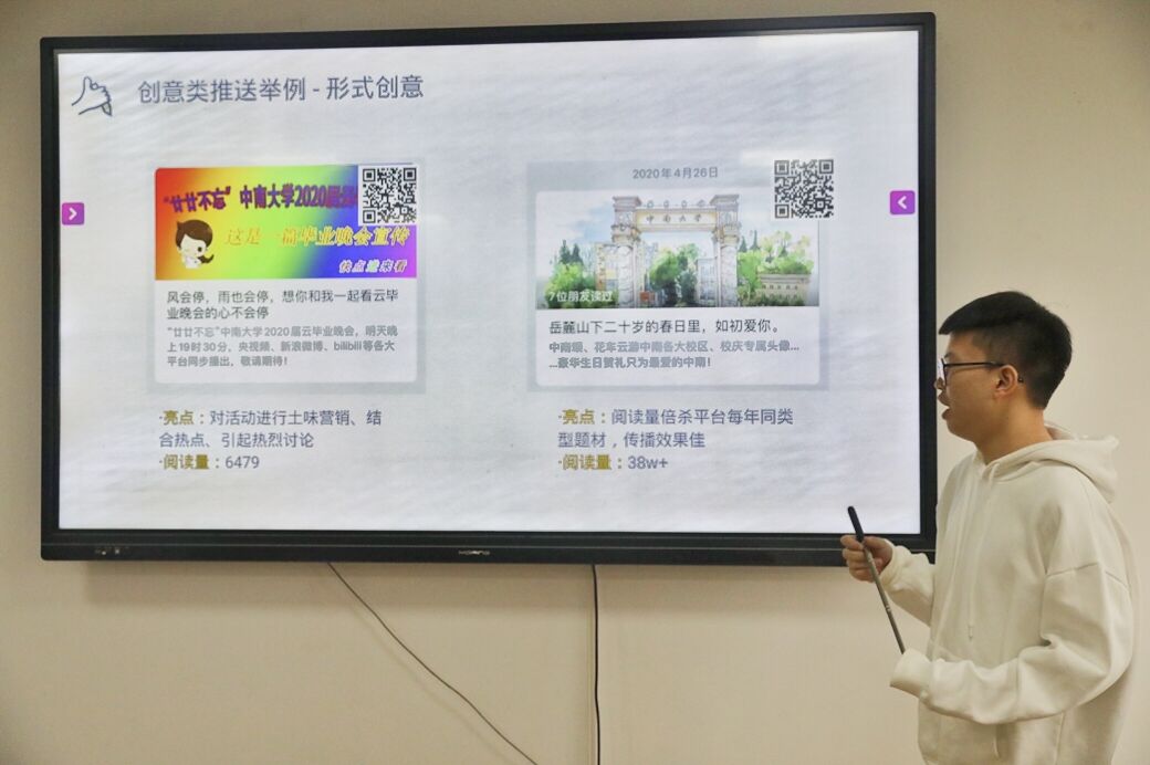 首先,李昂学长从策划与选题、文案、排版、优质内容推荐四个方面讲述“一篇推送的诞生”。其中,策划分为信息类推送和创意类推送,强调了推送信息的重要性、实效性以及价值观点的输出;对于创意类推送,李昂学长详细列举数类作品,通过两个简约的视频分享,直观明了地对比了推送美学和结构给读者带来的不同体验。分享完毕,现场同学兴趣盎然、意犹未尽,积极向学长提问“小标题制作”“文字编辑”等等疑惑,李昂同学一一解答,并推荐了一批实用便捷的制作网站和平台。