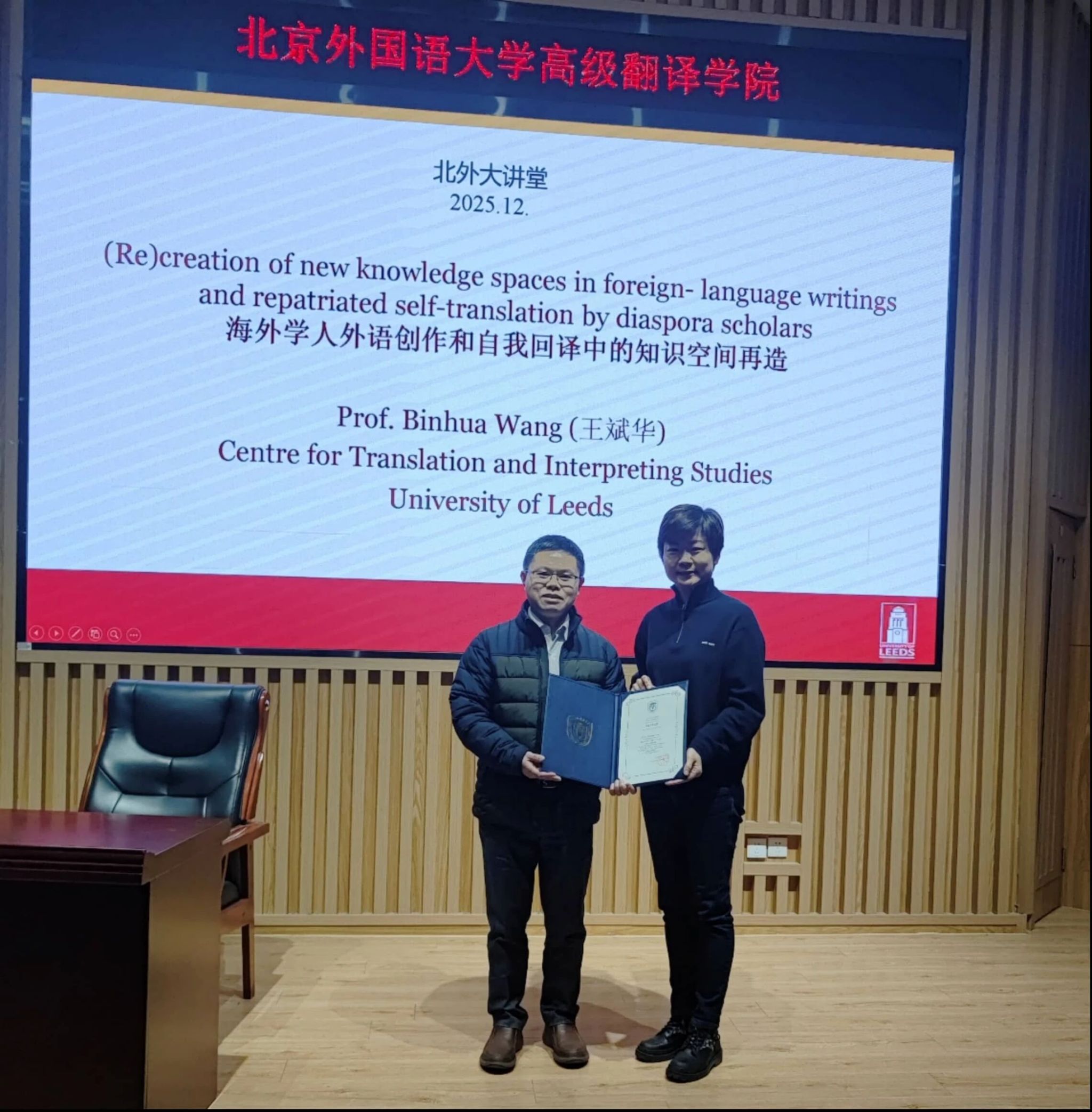 2025年12月1日晚,beat365正版唯一官网必一举办学术讲座,特邀英国利兹大学王斌华教授,以“海外学人外语创作和自我回译中的知识空间再造”为题展开深度分享。讲座开始前,beat365正版唯一官网必一党总支书记王薇薇为王斌华教授颁发了冠名讲席教授证书。讲座由院长任文教授主持。