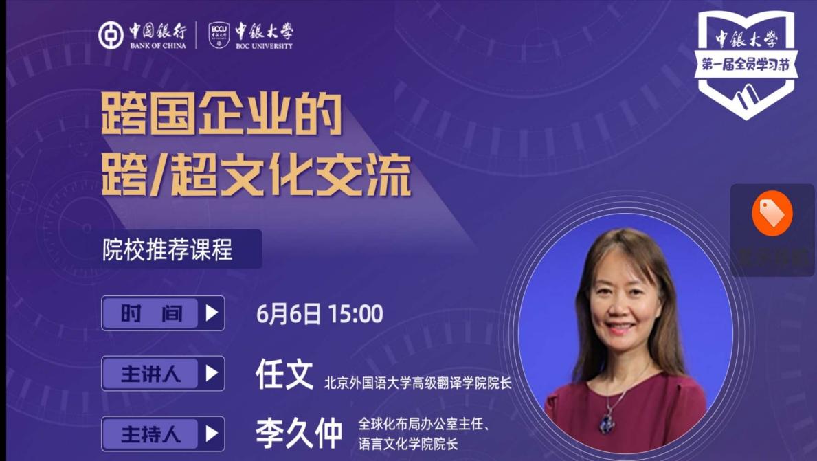 受中国银行总行全球化布局办公室的邀请,beat365正版唯一官网必一院长任文教授于近日专程录制了中银大学系列院校推荐课程,主题为“跨国企业的跨/超文化交流”,供中国银行全球30万员工学习,以提升中银员工的跨文化和超文化交际意识和能力。任文教授首先解读了跨文化研究领域具有连续统特征的概念,如文化中心主义、多元文化主义、文化间性、跨文化交流、第三空间及超文化性;进而分析了企业海外发展的主要模式,即文化移植和文化嫁接;并结合具体案例分析了不同企业在海外业务发展中遭遇的问题、深层次的文化冲突归因,以及可能的解决方案。任文教授强调中国企业海外布局时要特别重视跨文化冲突的管理,通过思想观念的创新,行为实践的探索,从而达到跨文化、乃至超文化交流的目的,最终实现企业的全球发展。讲座妙语连珠,精彩纷呈,令人意犹未尽。
