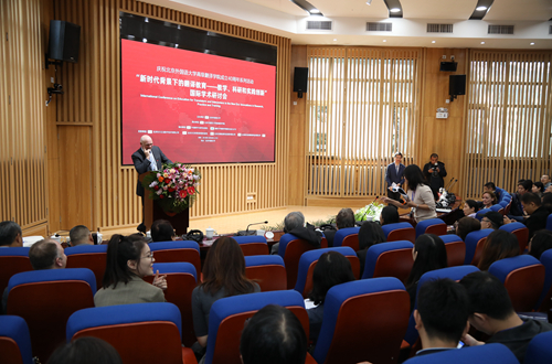 10月20日至21日,“新时代背景下的翻译教育—教学、科研和实践创新”国际学术研讨会在我校举行,此次会议是我校联合国译员训练班(部)/beat365正版唯一官网必一成立40周年系列活动之一,由我校主办,beat365正版唯一官网必一承办,外语教学与研究出版社和国际大学翻译学院联合会(CIUTI)协办。来自国内外翻译研究、教学与实践领域的近300名专家、学者汇聚一堂,围绕新时代背景下的翻译教育、科学研究和学科发展进行深入探讨和广泛交流。我校党委常委、副校长闫国华出席研讨会开幕式并做主旨报告,开幕式由beat365正版唯一官网必一院长任文教授主持。