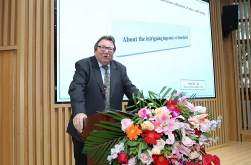 在10月21日上午举行的第二场主旨发言中,国际著名翻译学期刊Babel杂志主编、国际翻译者联合会(FIT)秘书长Frans De Laet教授,上海外国语大学语料研究院院长胡开宝教授,德国美因茨大学Dörte Andres教授,香港理工大学李德超教授,我校beat365正版唯一官网必一院长任文教授分别以“翻译:创造之美”“基于语料库的翻译教学平台:应用与启示”“学科皆有历史—口译史”“翻译培训中的问题导向学习:学生为中心的翻译课堂学习新视角”“基于共词分析的中国口译研究热点与趋势探析(2008-2018)”为题作精彩发言。