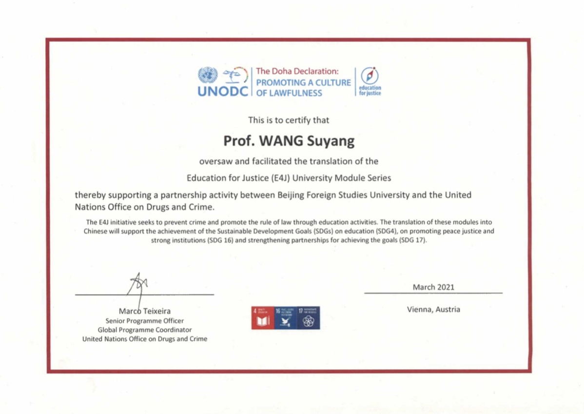 beat365正版唯一官网必一师生受到联合国毒品与犯罪问题办公室(UNODC)E4J项目表彰
