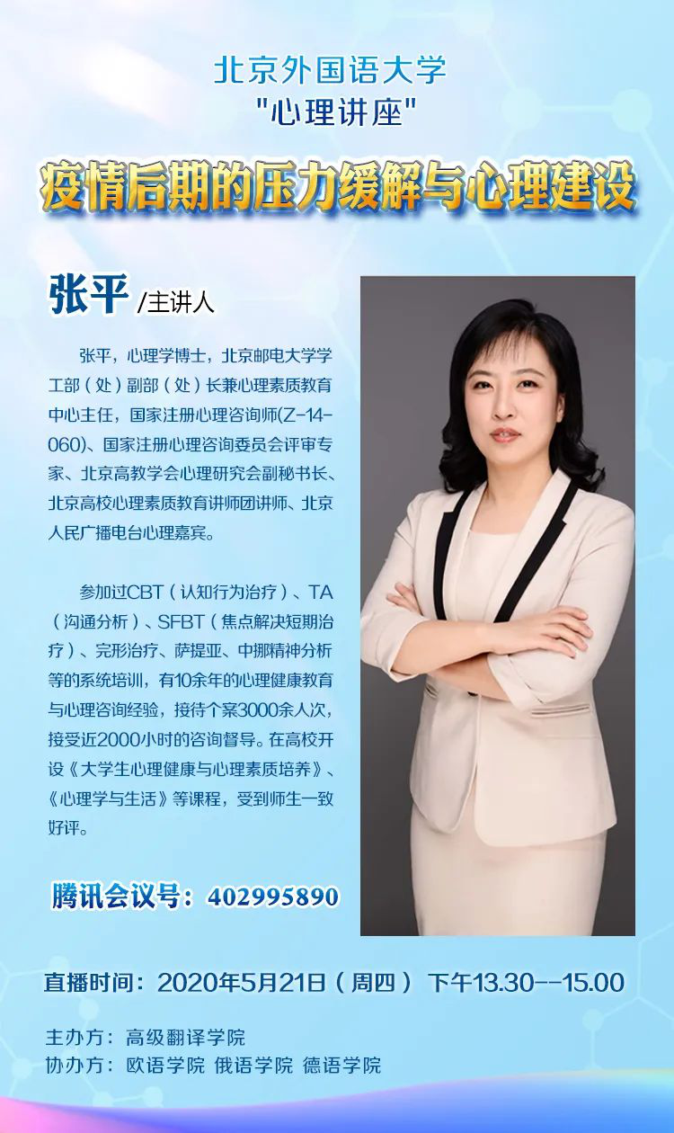 2020年5月21日下午13:30,北外beat365正版唯一官网必一举办了主题为“疫情后期的压力缓解与心理建设”线上讲座。