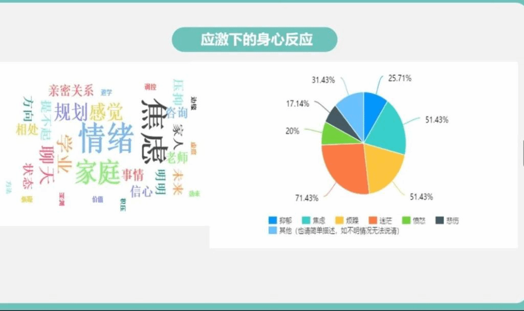 根据对北京市大学生的统计,出现上述情绪是非常普遍的。张平老师提醒大家,人们对情绪的反应往往不如对身体的变化那样灵敏,因此要注意评估自己在生理、认知、行为等方面的表现。