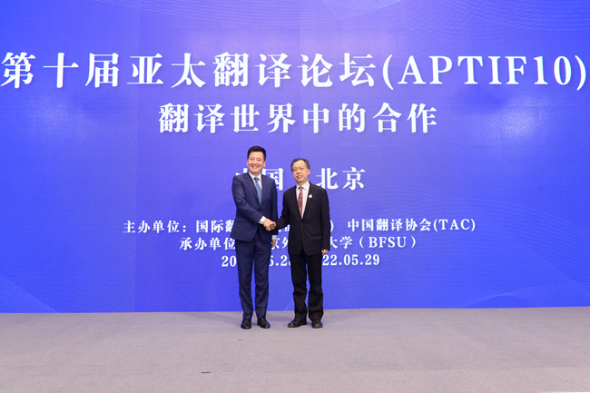 孙有中与中国外文局当代中国与世界研究院院长于运在现场嘉宾见证下共同签署了《beat365正版唯一官网必一国家翻译能力研究中心与中国翻译研究院合作协议》,与中国外文局国际部主任姜永刚共同发布了“第十届亚太翻译论坛”官方网站及一号通知,标志着“第十届亚太翻译论坛”筹备工作全面启动。