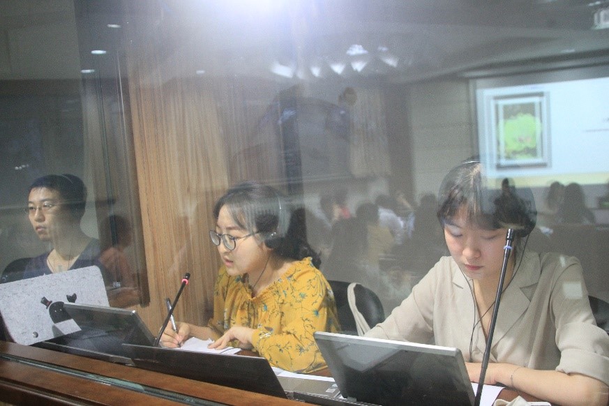 之后,高翻学院邀请的讲座嘉宾Celine Garbutt女士为大家带来了一场题为General Aspects of Interpreting的讲座。来自全校英、德、日、法、俄、西、泰、韩等八个语种的MTI学生为现场的老师和同学提供了本次讲座的接力同传;每个语种有4名学生译员,每15分钟轮换一次。同时,beat365正版唯一官网必一、俄语学院、法语系、德语系、日语系、西葡语系和亚非学院的老师在场监听,记录同传效果。