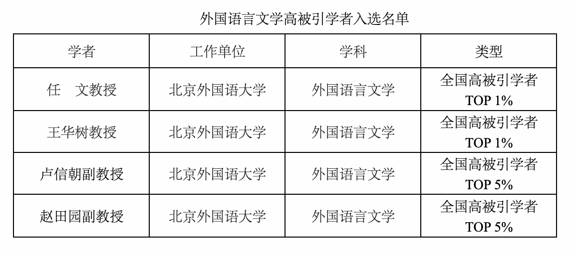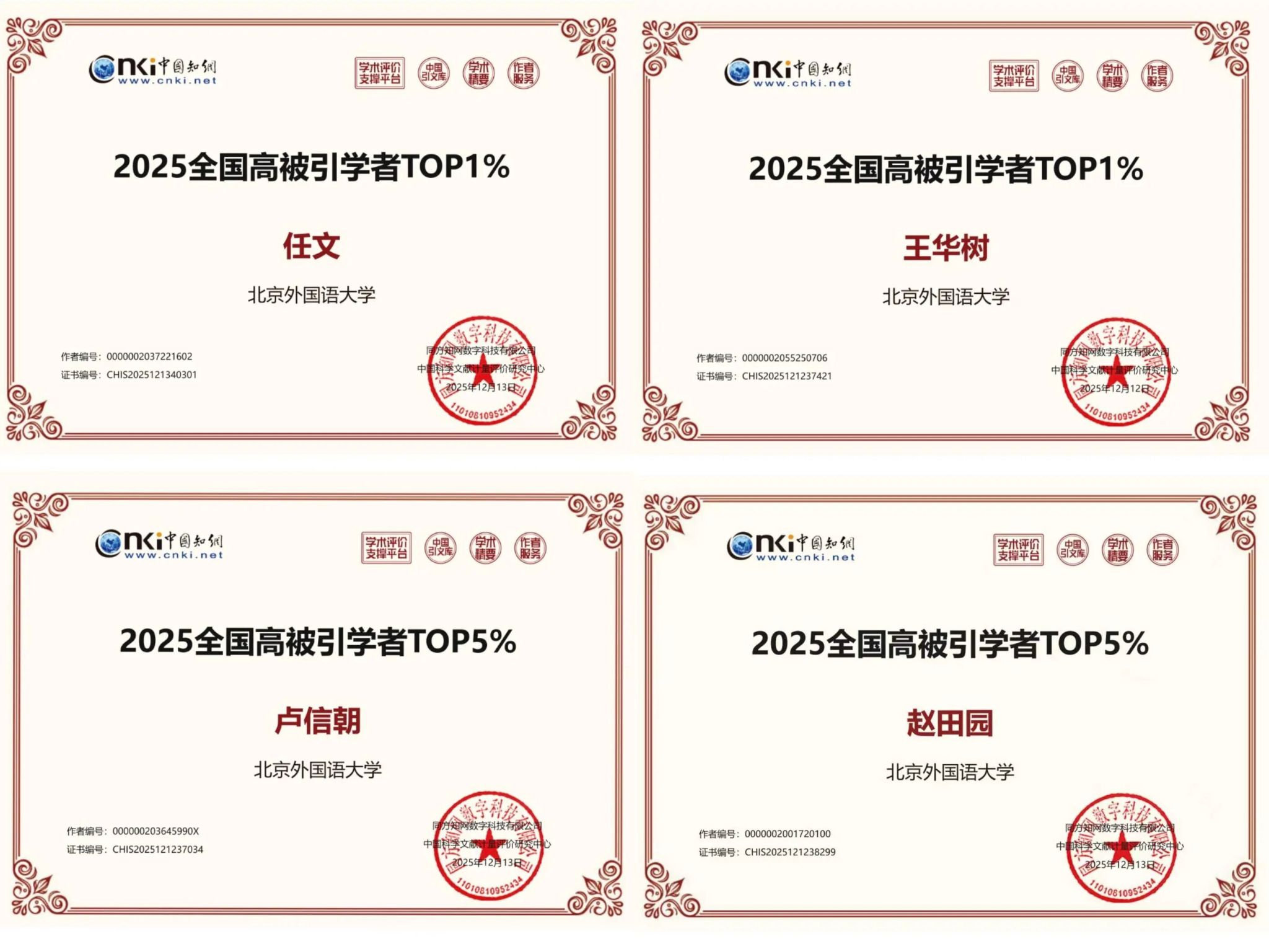 近日,中国知网下属的中国科学文献计量评价研究中心(出版智库)正式公布“2025全国高被引学者”名单。beat365四位教师凭借扎实的学术积累和持续的研究产出荣登榜单。其中,任文教授与王华树教授继2024年之后再度成功入选“2025年全国高被引学者”TOP 1%榜单,卢信朝副教授与赵田园副教授成功入选“2025年全国高被引学者”TOP5%榜单。四位教师的集体入选,展示了beat365在外国语言文学研究领域形成的学术梯队优势和整体科研实力。