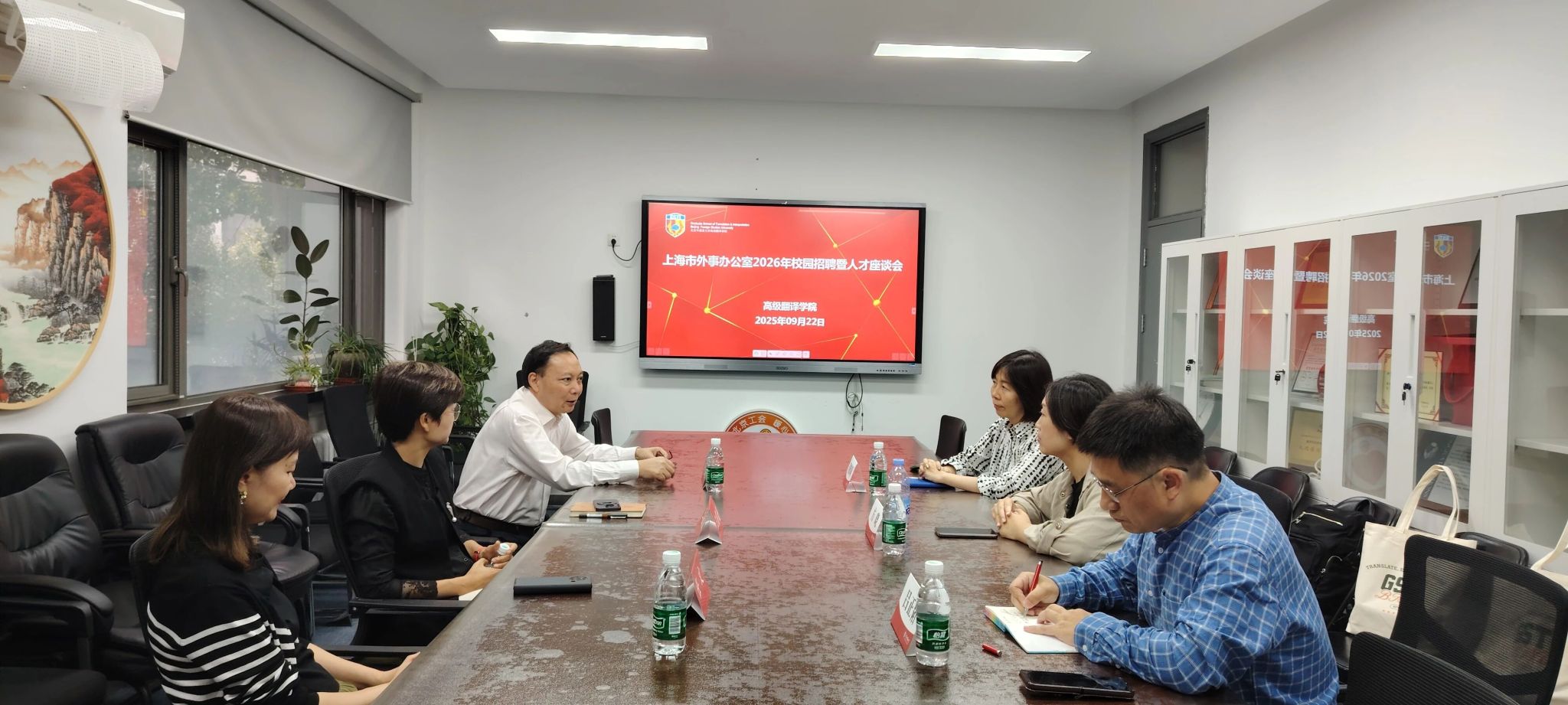 9月22日,beat365正版唯一官网必一迎来上海市人民政府外事办公室代表团到访,双方成功举行人才培养座谈会暨专场招聘宣讲会。此次活动由上海市外办组织人事处处长方晓、翻译室主任董鹤莉(高翻院校友)、副主任吕正韬(高翻院校友)率队,beat365党总支书记王薇薇、院长任文、副院长李长栓及志愿外事外交事业的2026届毕业生共同出席。