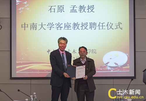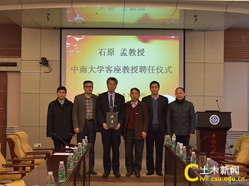 2015年12月11日上午,日本东京大学土木工程系主任石原孟教授应邀来访我校,在铁道校区世纪楼14楼会议室现场受聘为vwin德赢ac米兰官方网客座教授。土木院院长谢友均、党委书记蒋琦玮、副院长何旭辉、副院长蒋丽忠、桥梁系主任戴公连、力学系主任李东平等老师参加了会议。