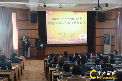 许毅副处长主持了仪式,谢友均院长对Ahsan Kareem教授的情况做了详细介绍,表示希望以此为契机,加强两校之间的学术交流和人才交流,进一步提高我校的综合实力。