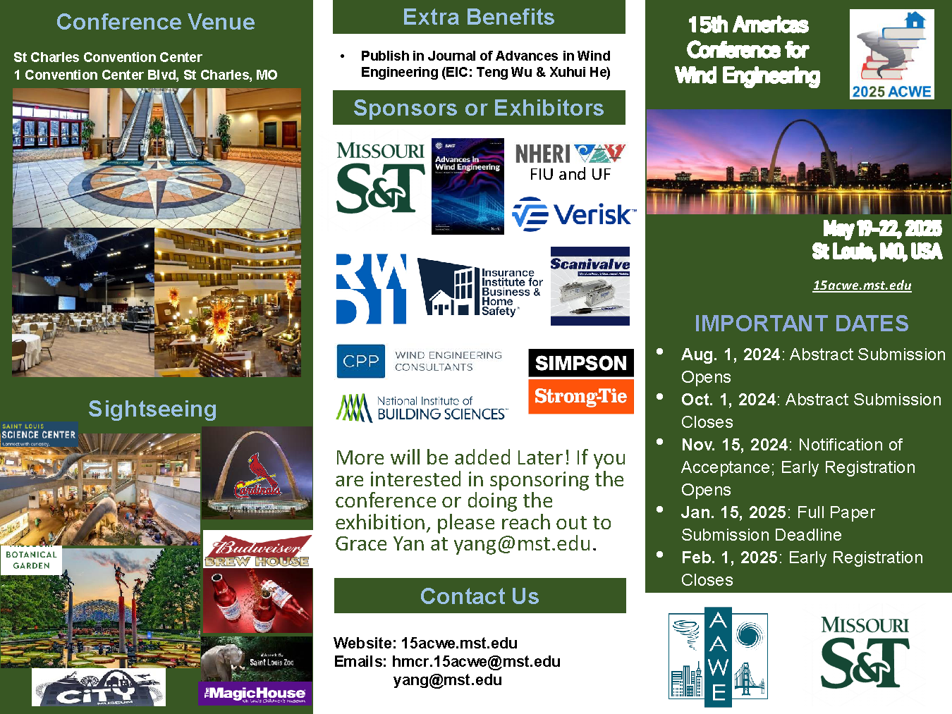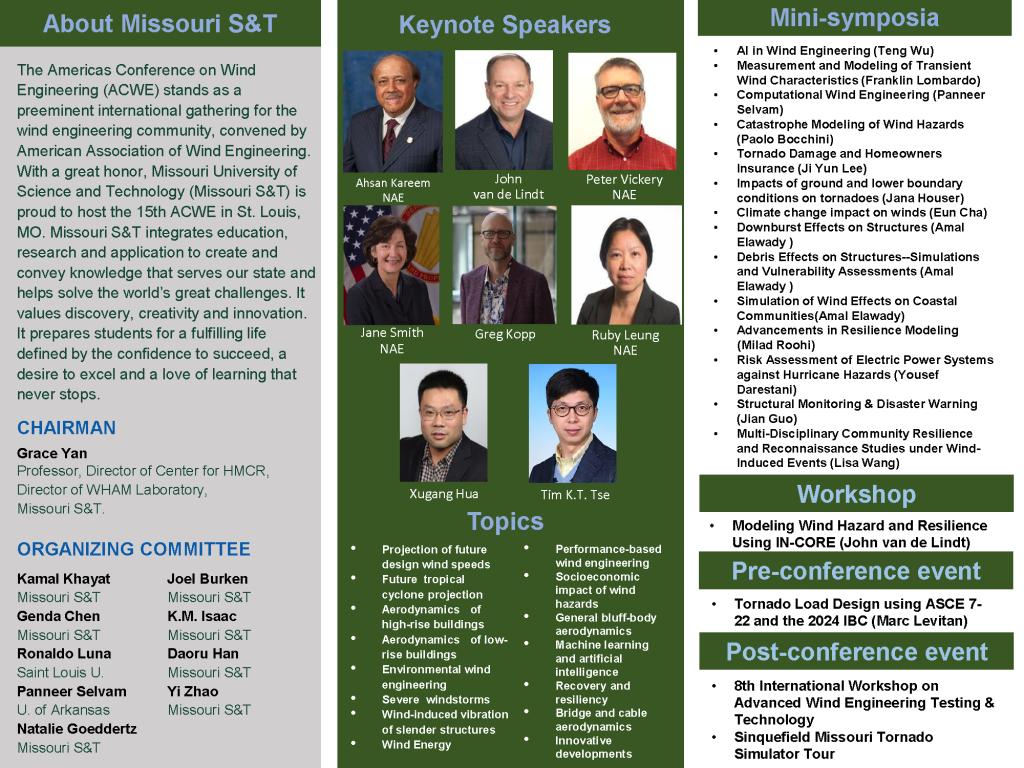 第15届美洲风工程会议(ACWE)将于2025年5月19日至22日在密苏里州圣路易斯举行。(接待和所有会前活动将于5月19日举行,5月20日将是会议的第一天)。有关更多信息,请参阅附件中的会议通知或以下会议官方网站:https://15acwe.mst.edu/。