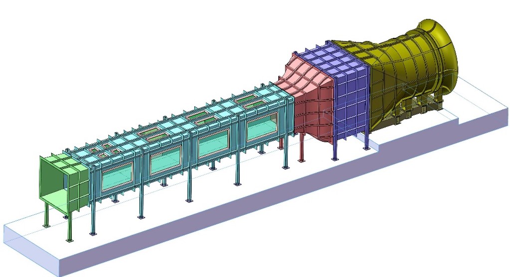 CSU-WT1风洞于2012年完成验收并正式投入使用。该风洞为闭口回流低速风洞,洞体为全钢结构,风洞主体回路由两个实验段、一个动力段、两个稳定段、两个收缩段、三个扩散段及六个拐角段构成,其中动力段采用六台335KW直流电机驱动轴流风机并列布置构成阵列式风扇段。实验室共有两个试验段,其中低速试验段宽12米、高3.5米、长18米,风速范围0~20米/秒,湍流度小于1%;高速试验段宽3米、高3米、长15米,风速范围0~94米/秒,湍流度小于0.5%。实验室配备有高频电子压力扫描阀、高频风洞天平、眼镜蛇风速探针、热线风速仪、激光位移传感器、三分量力传感器、微型压力传感器、加速度传感器、动态数据采集分析系统等先进的仪器设备,适合于开展于桥梁风工程、列车空气动力学、结构风工程、风环境、风能利用等研究。